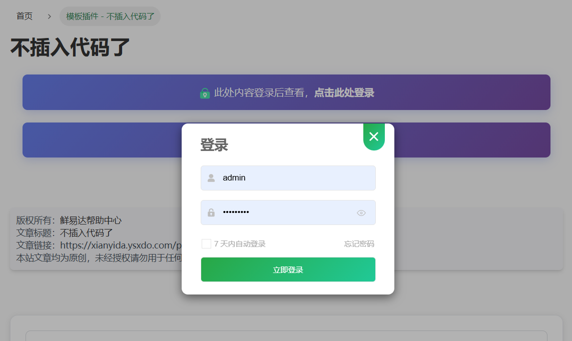 插件功能回复可见,登录可见,未登录弹窗,同一文章10分钟内只弹窗1次。